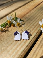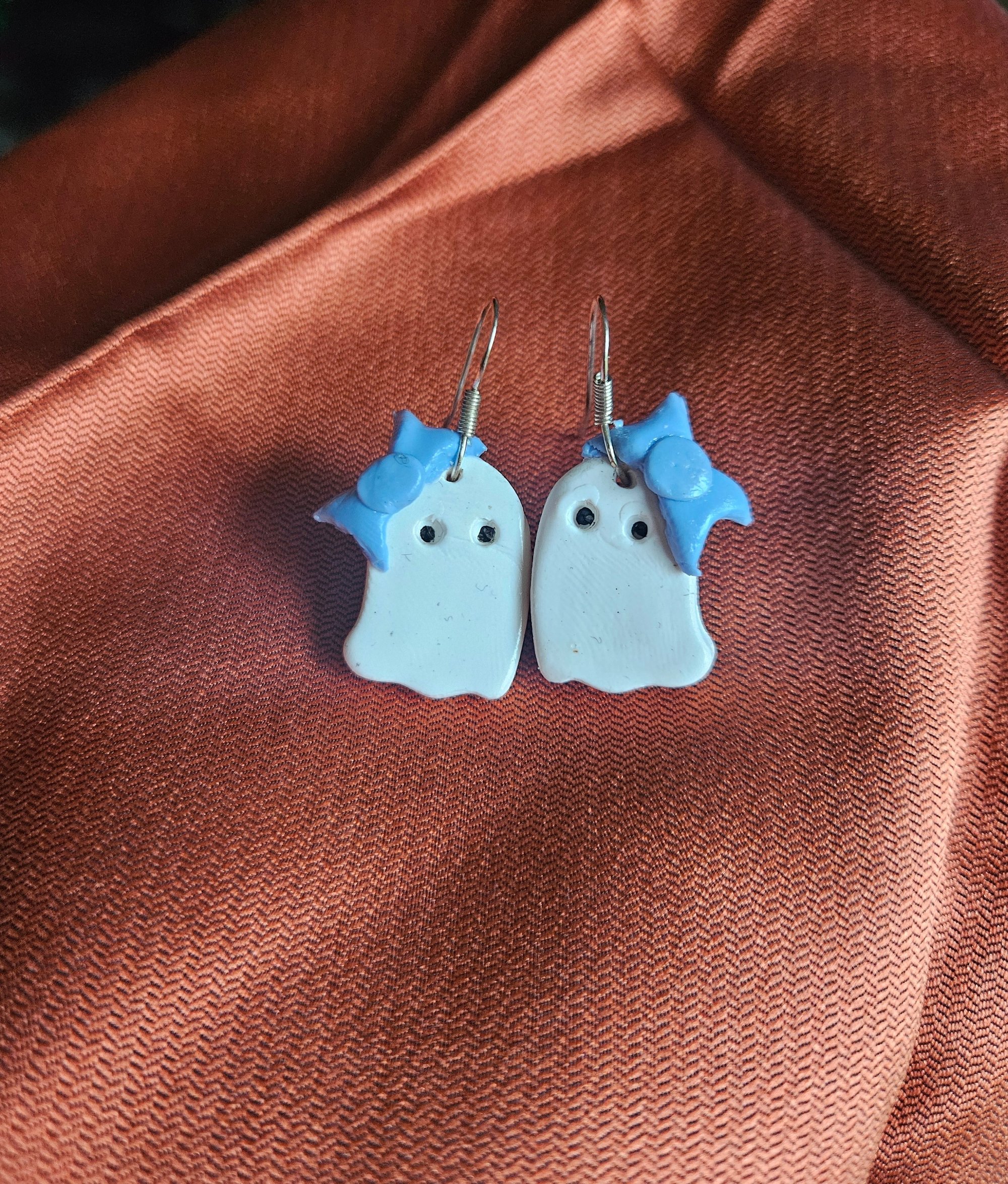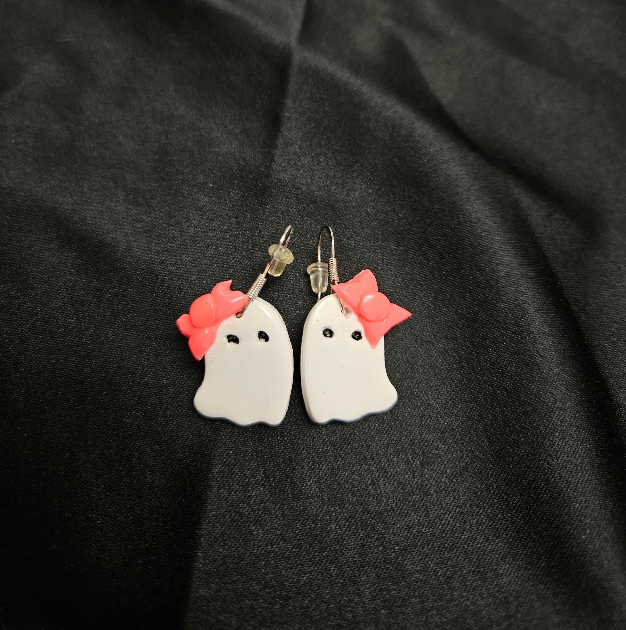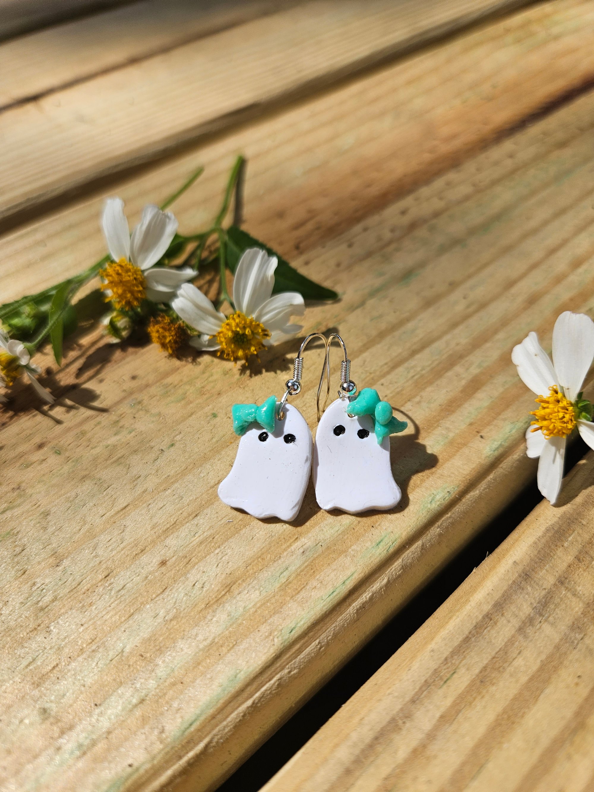 Handmade ghost earrings with bows, perfect for October! Made with polymer clay and .925 stamped sterling silver hooks. Clear earring backs included.