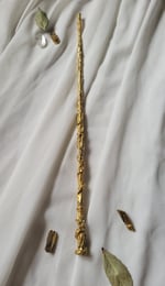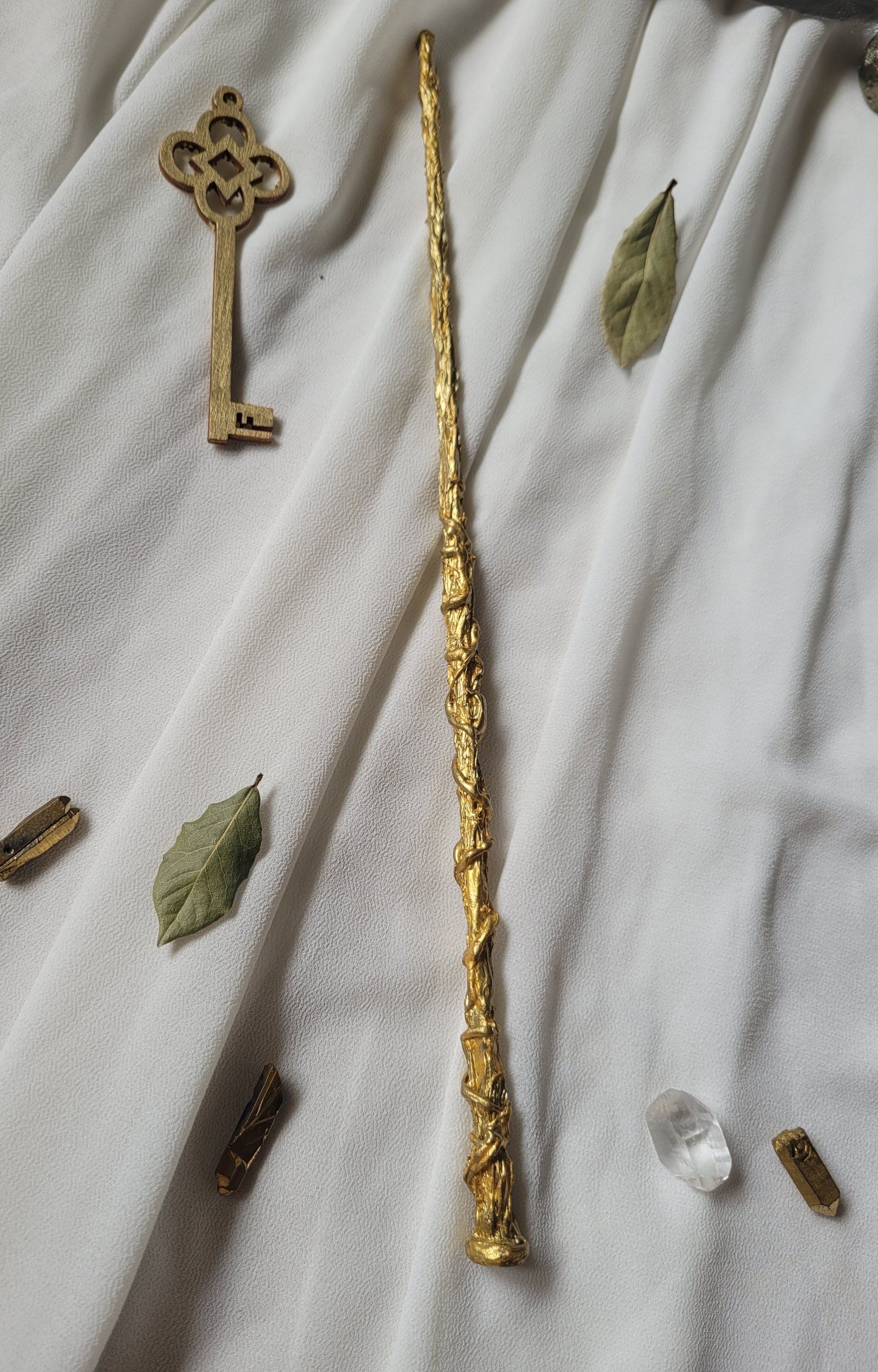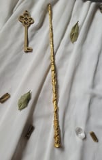 Hand crafted and painted magic golden wand. This can be used as Halloween decor, part of a costume or just for the wizard in you. Made with a stainless steel metal rod so it wont break, also sprayed with a protective sealant. 🔮